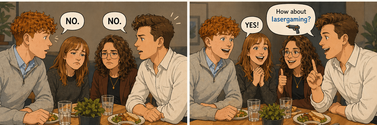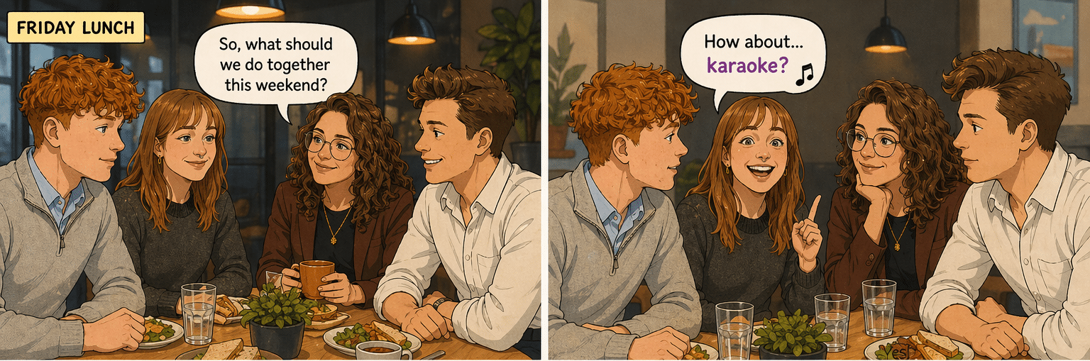 Image prompt: Make a little cartoon using the four people in the pictures added to this prompt. I want the cartoon to show a couple of scenes of them eating together at the table and discussing what to do for an activity together with their other colleagues. One of the girls suggests doing karaoke, then the boys look at each other and simultaneously say no. Then one of the guys suggests laser gaming, to which the other people in the picture look enthusiastic and nod their head or say yes in agreement.
