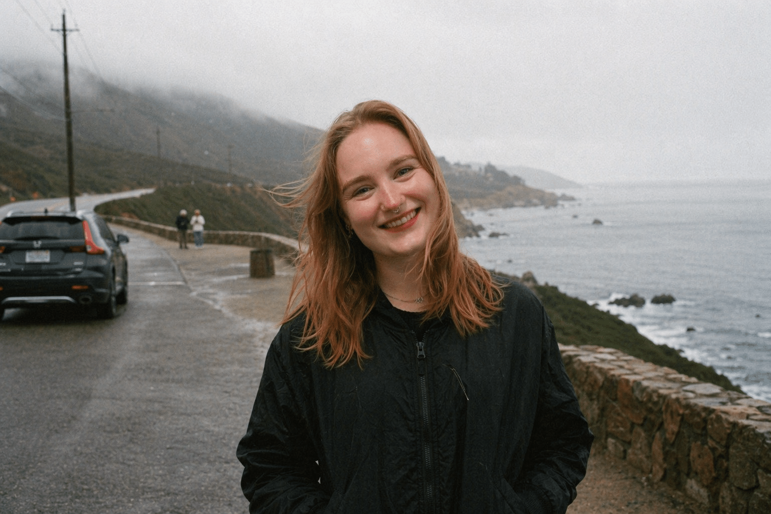 A photorealistic candid travel scene of the girl in the picture standing at a coastal roadside turnout on an overcast morning, shot on 35mm film. Natural imperfect framing, visible grain, ambient light, muted colors, wind in clothing and hair, cinematic realism, and the feeling of a lived-in documentary photograph.